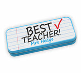 Stylish, high quality pencil tin is printed with name and our Best Teacher design.