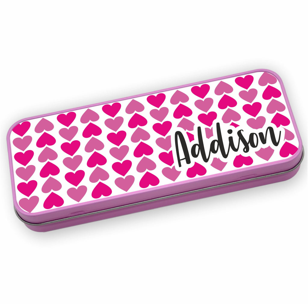 Stylish, high quality pencil tin is printed with name and our Heart design.